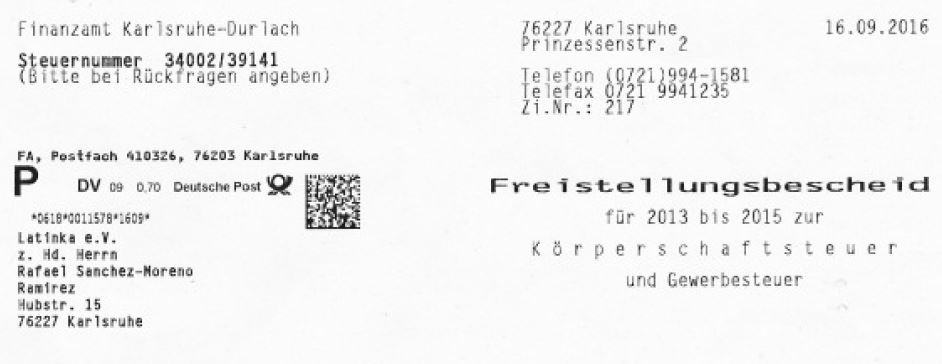 Der Freistellungsbescheid für die Jahre 2013 bis 2015 wurde uns durch das Finanzamt Karlsruhe-Durlach ausgestellt!!!
