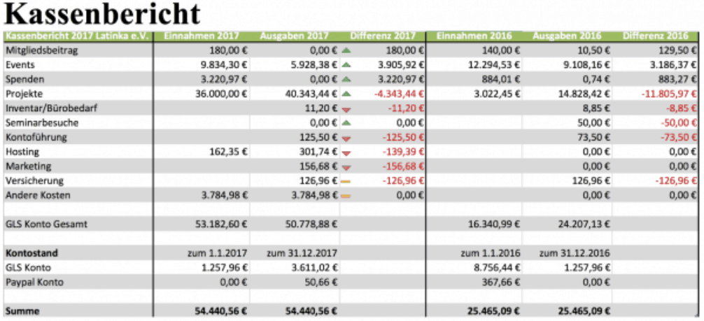 An der am 25.01.2018 stattfindenden Jahresversammlung von Latinka e.V. wurde der Kassenbericht für das abgeschlossene Jahr 2017 vorgestellt und abgenommen.