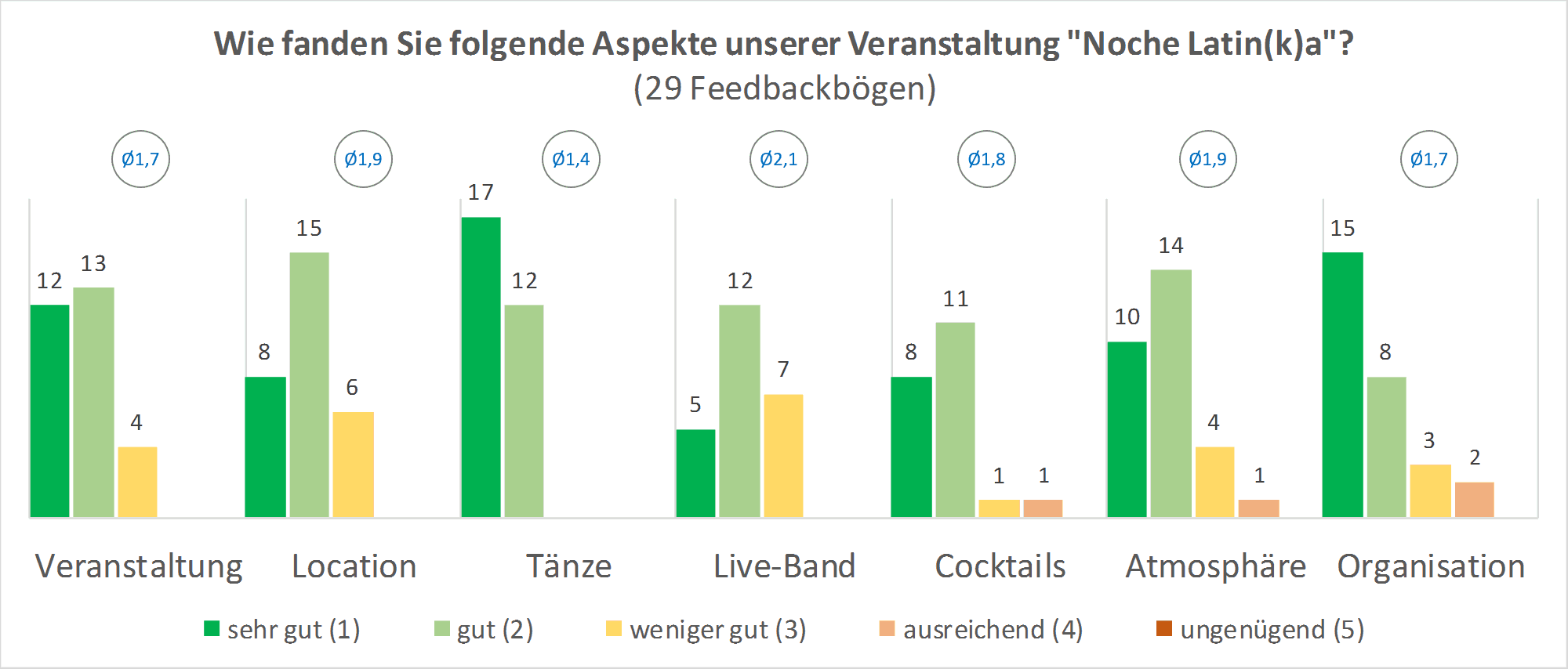 Monatelange harte Vorbereitung liegt hinter uns. Um so schöner ist es, wenn wir mit so einem guten Feedback belohnt werden. 29 Personen haben das Feedback-Formular bewertet und uns auch geschrieben wie wir besser werden können. Ihr habt uns tolle konstruktive Kritik gegeben, die wir selbstverständlich ernst nehmen und in unseren nächsten Events einfliessen lassen werden. Vielen Dank für Eure Offenheit uns gegenüber!
