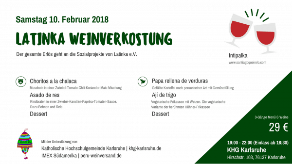 Tenemos el gusto de invitarles al primer evento del año la 7ª Cata de vinos Latinka. Será el 10 de febrero en la KHG Karlsruhe.